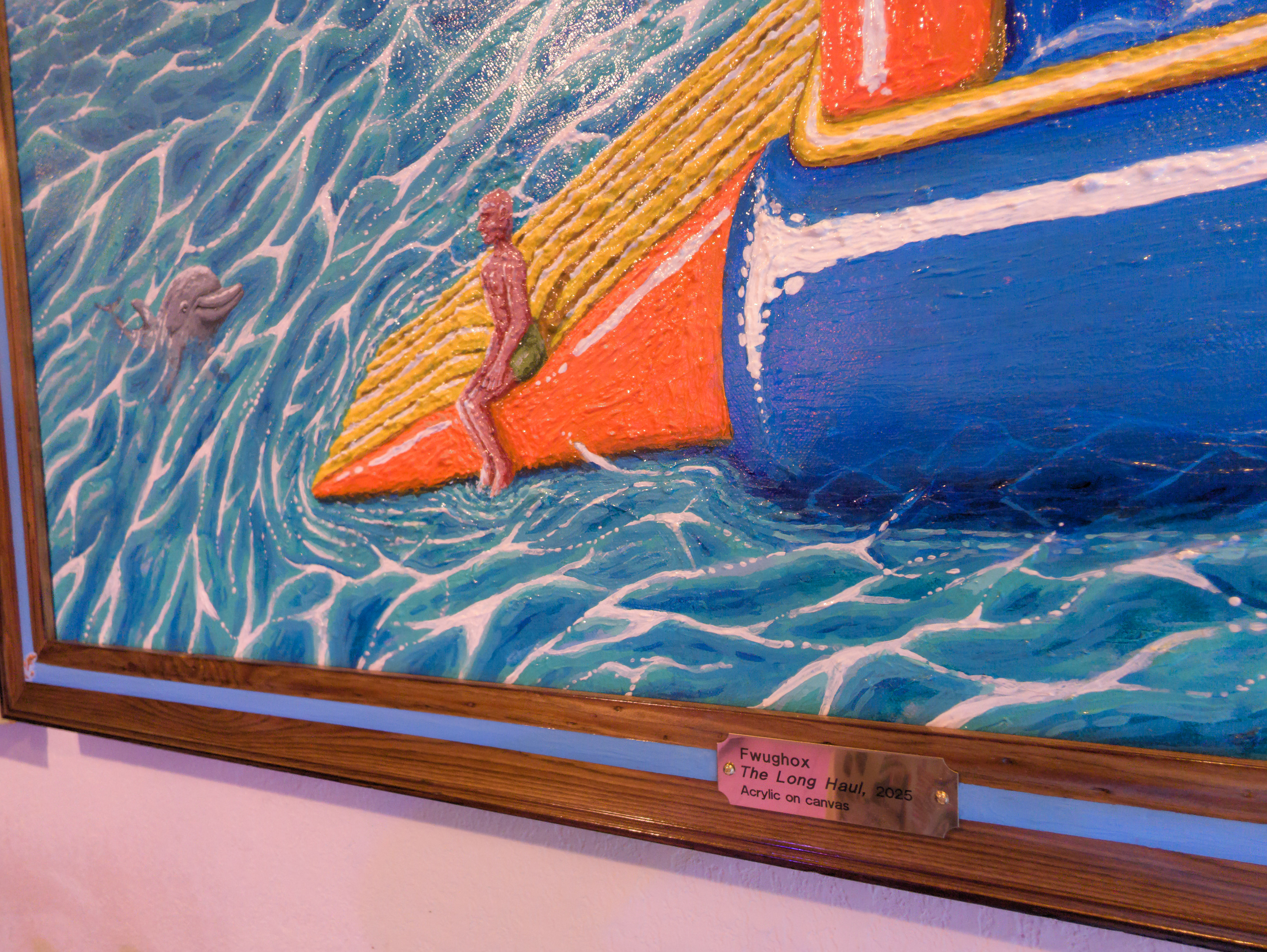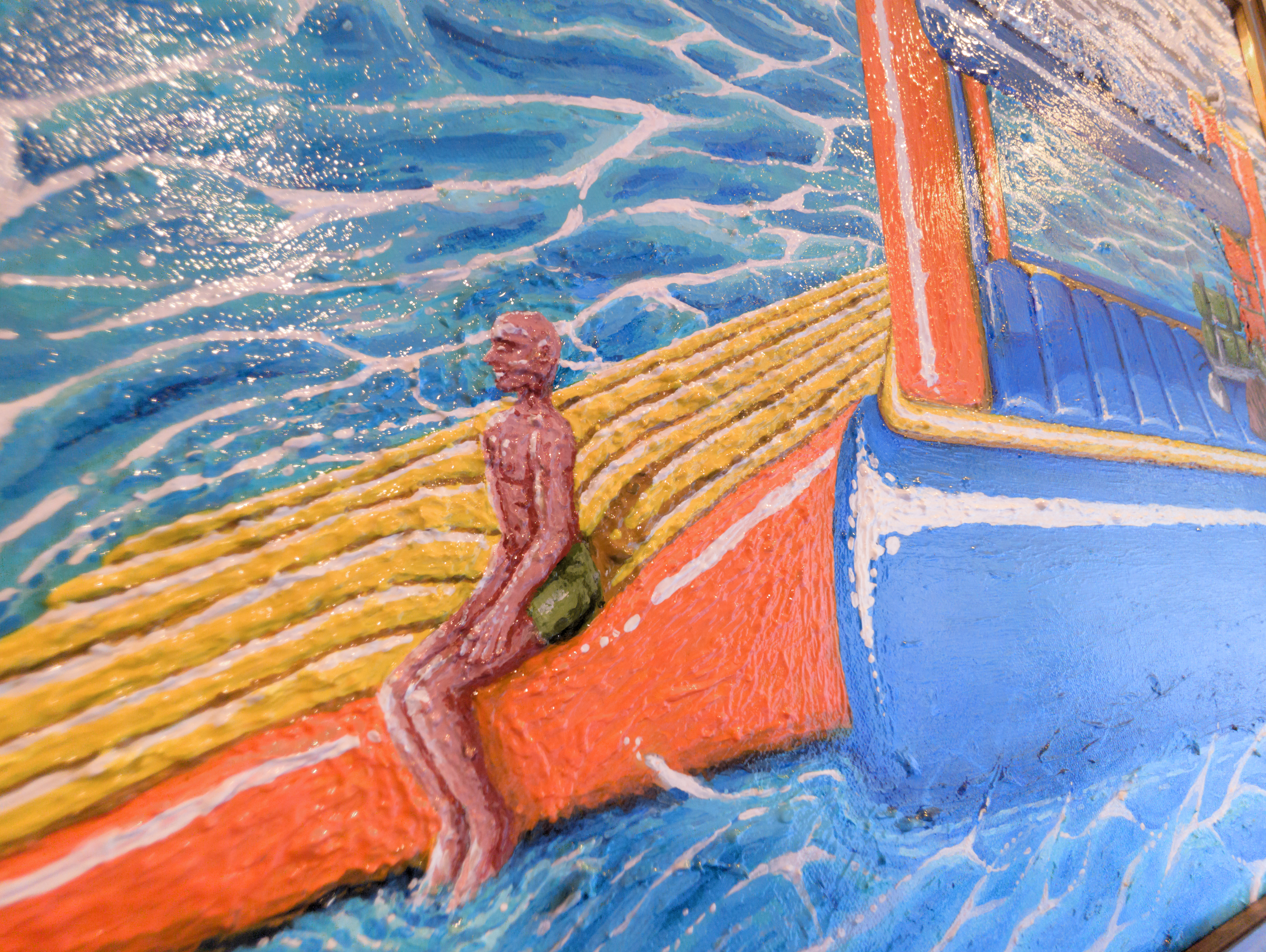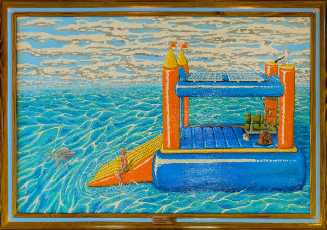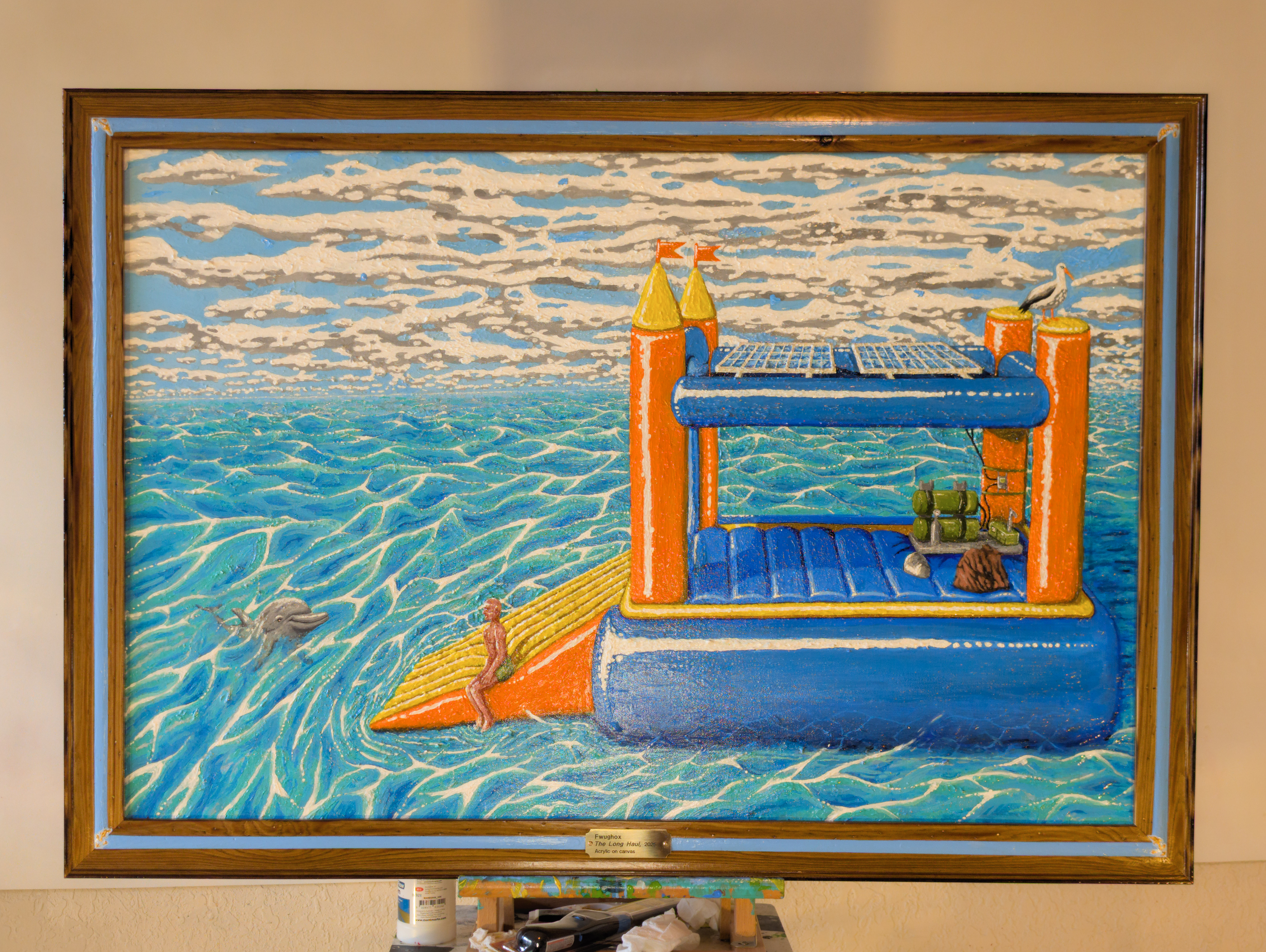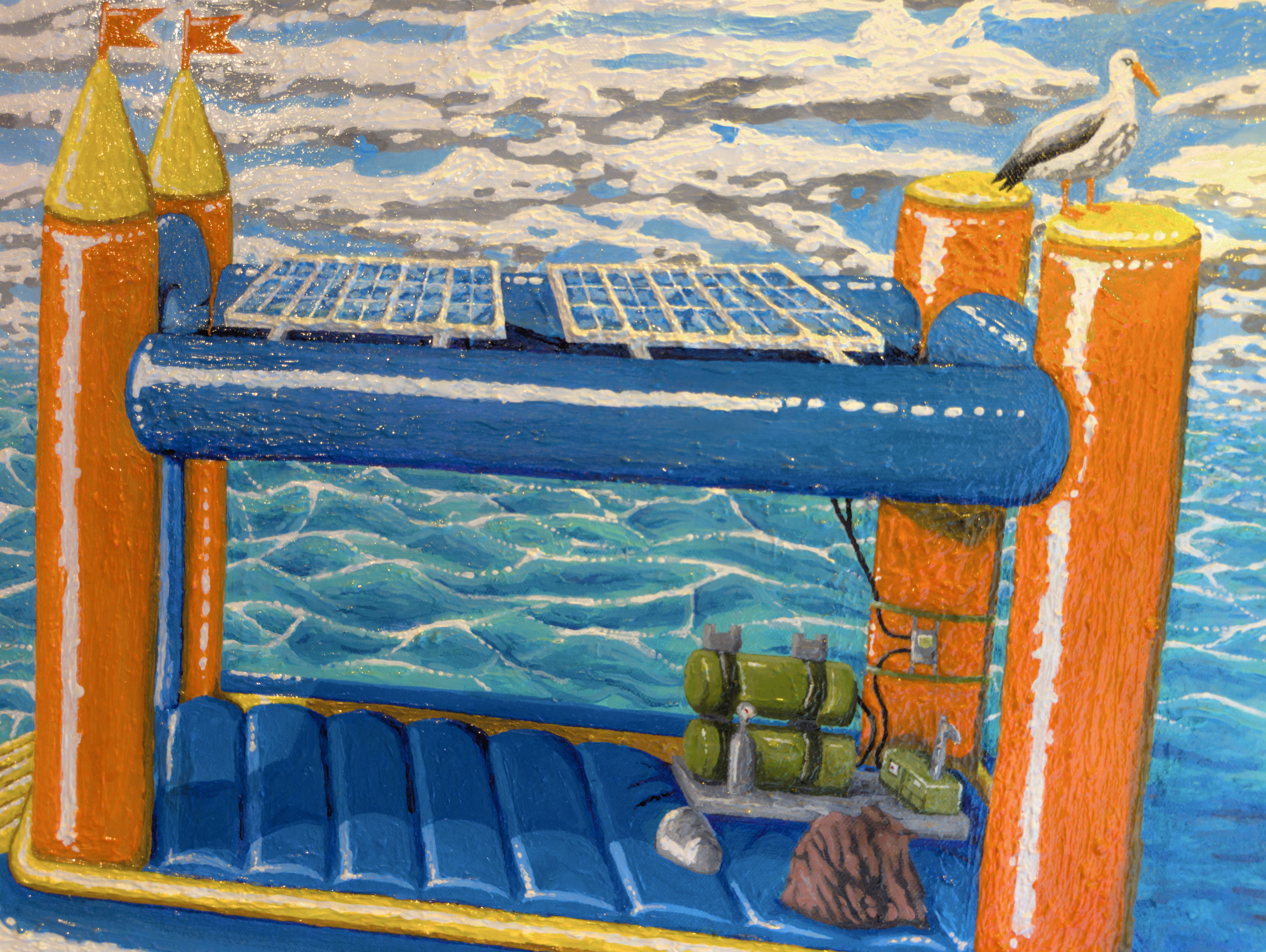 I became fixated on that silly mental image. Fwughox.com wasn’t even a year old at the time, but it existed, and I decided to write a story that felt thematically appropriate to the sort of thing I was doing with the site at the time – surreal and incomprehensible, yet playful. In the painting, you can see the protagonist of that story, Dion, sharing a calm moment out at sea in his punishment vessel with his dolphin friend. The castle is equipped with only the bare minimum of what he needs – solar panels, supply bags filled with “the essentials”, a desalinator for drinking water, and the few bits and bobs required to utilize those things.