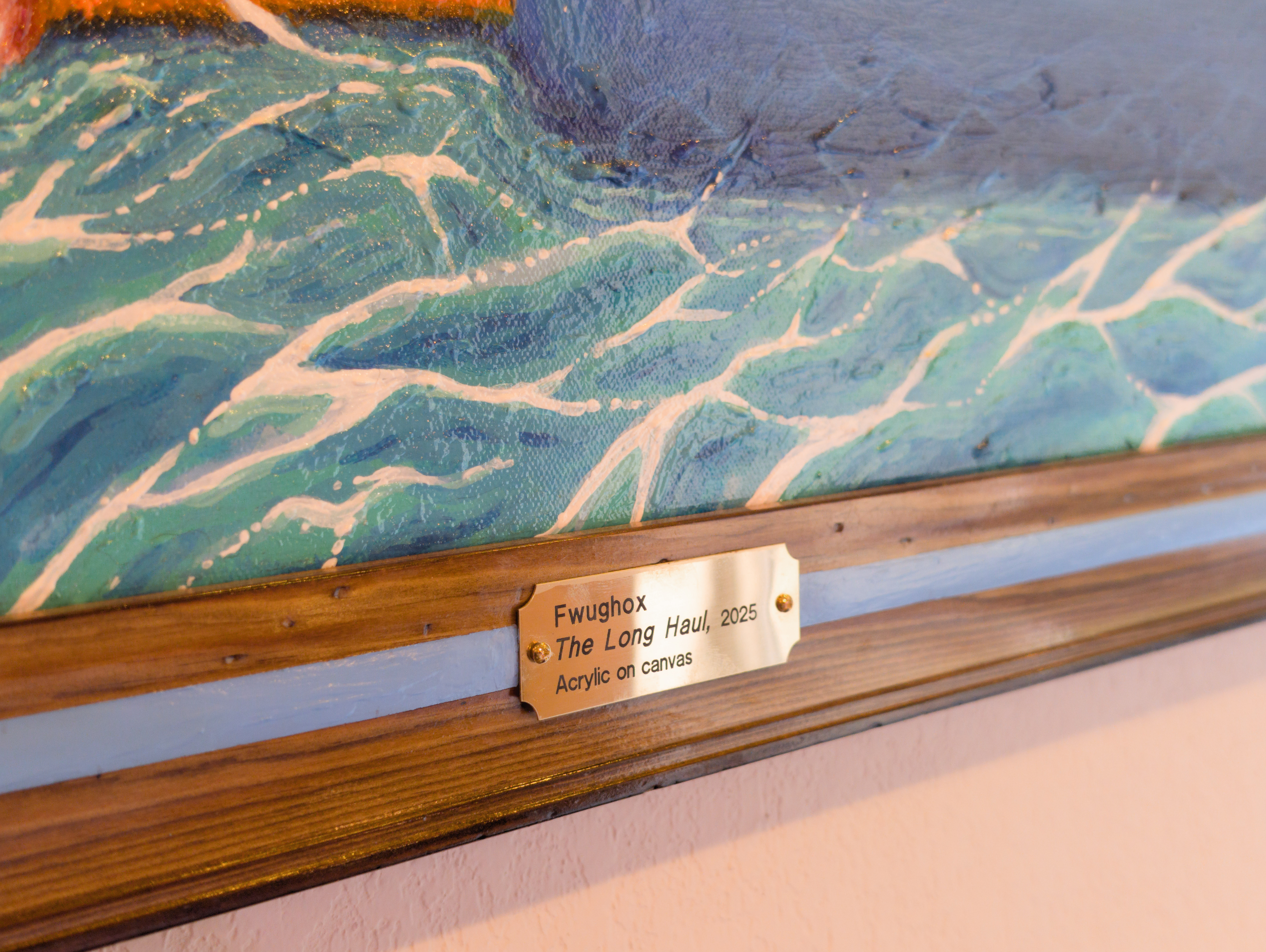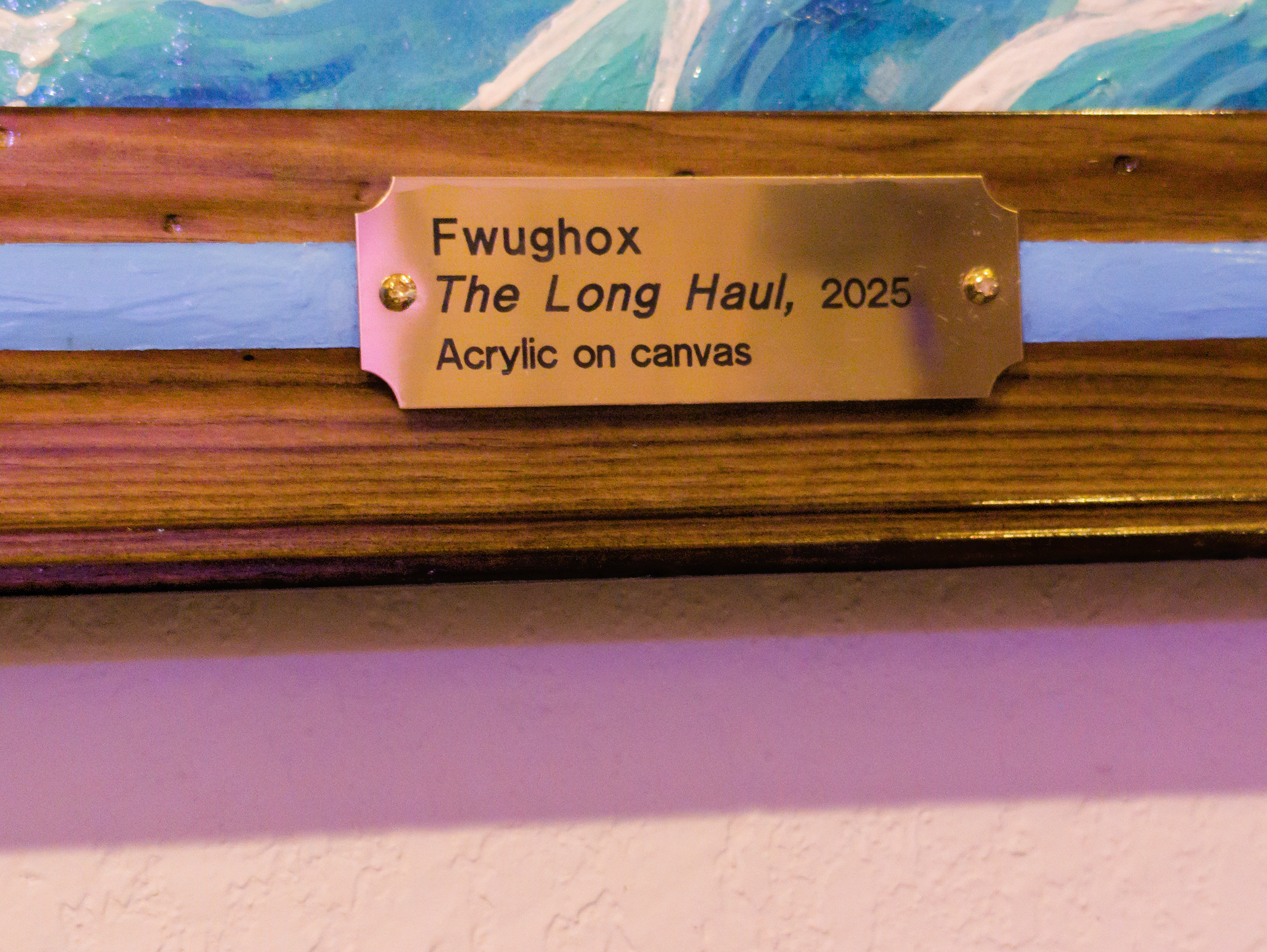Frame notes: Burnt pine base / acrylic details / Polycrylic topcoat / Wire hanger on back / Shiny brass oxidized info plate