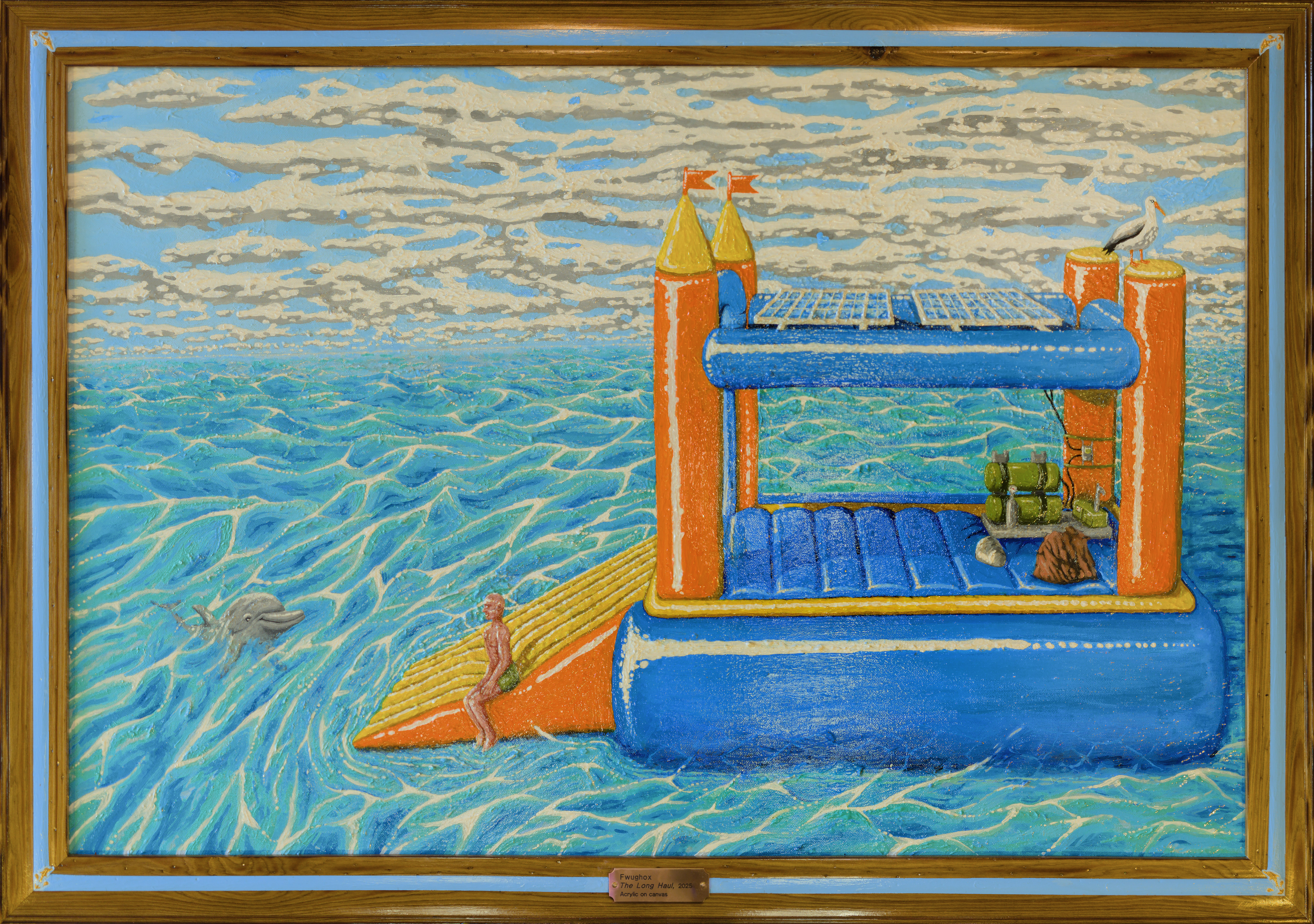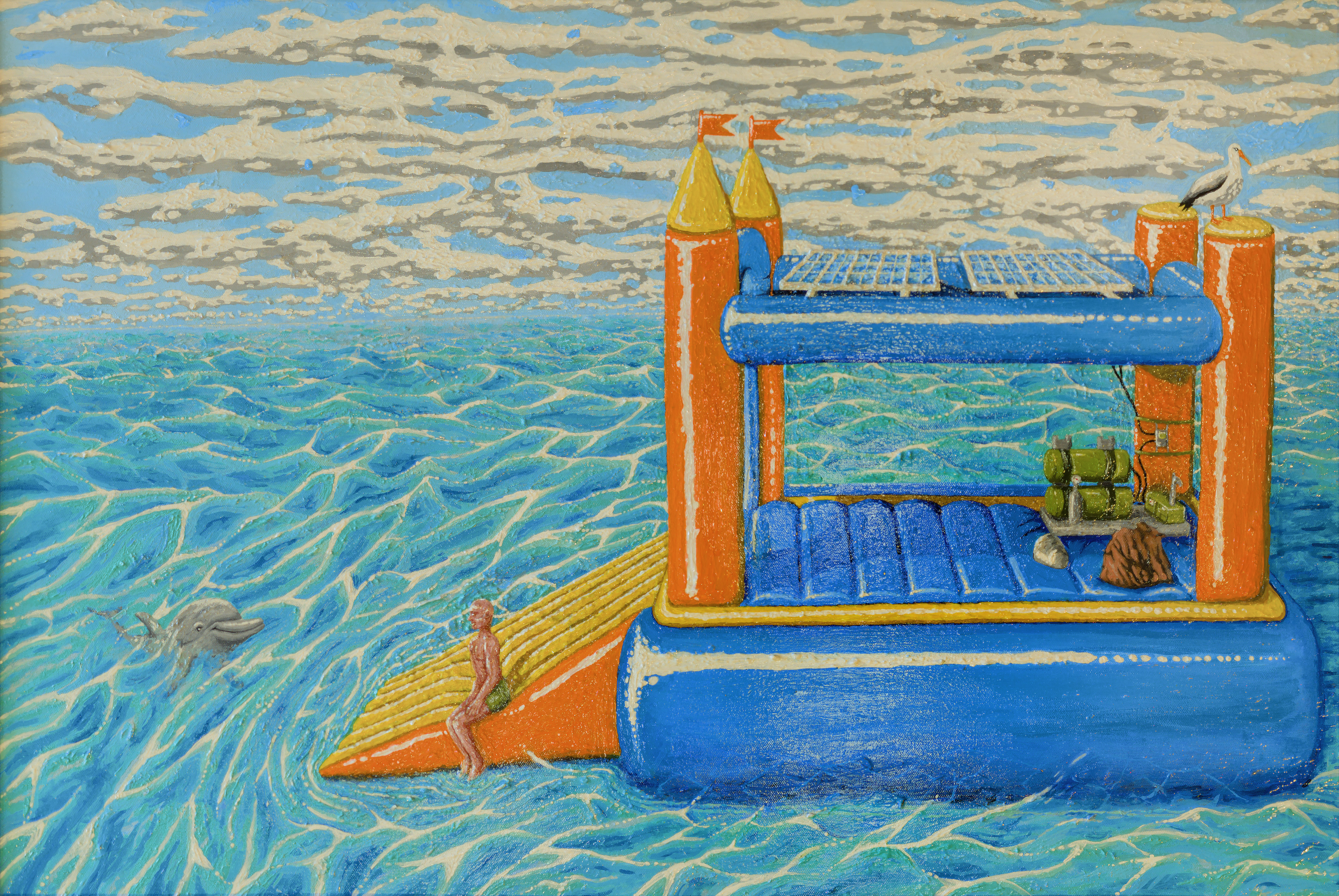 I became fixated on that silly mental image. Fwughox.com wasn’t even a year old at the time, but it existed, and I decided to write a story that felt thematically appropriate to the sort of thing I was doing with the site at the time – surreal and incomprehensible, yet playful. In the painting, you can see the protagonist of that story, Dion, sharing a calm moment out at sea in his punishment vessel with his dolphin friend. The castle is equipped with only the bare minimum of what he needs – solar panels, supply bags filled with “the essentials”, a desalinator for drinking water, and the few bits and bobs required to utilize those things.