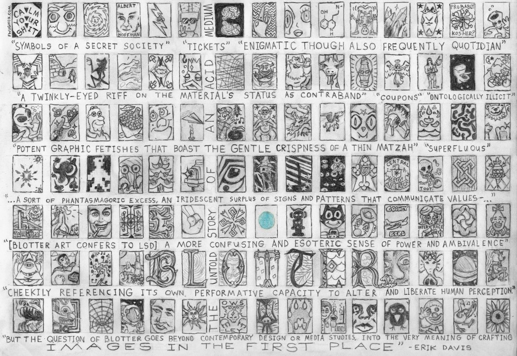 Inspired by the newly released book “Blotter: The Untold Story of an Acid Medium” by Erik Davis. Designs include actual historical blotter art pieces used on the street acid scene, re-interpretations of old blotter art pieces, as well as my own little patterns and characters.