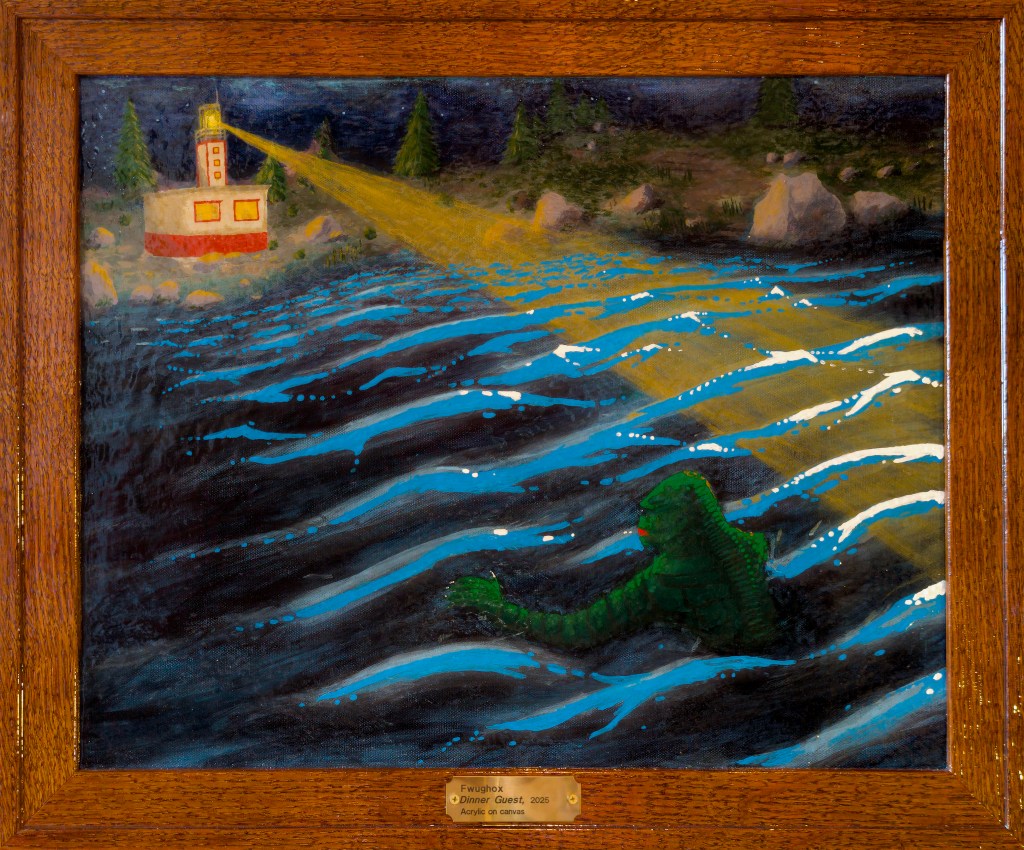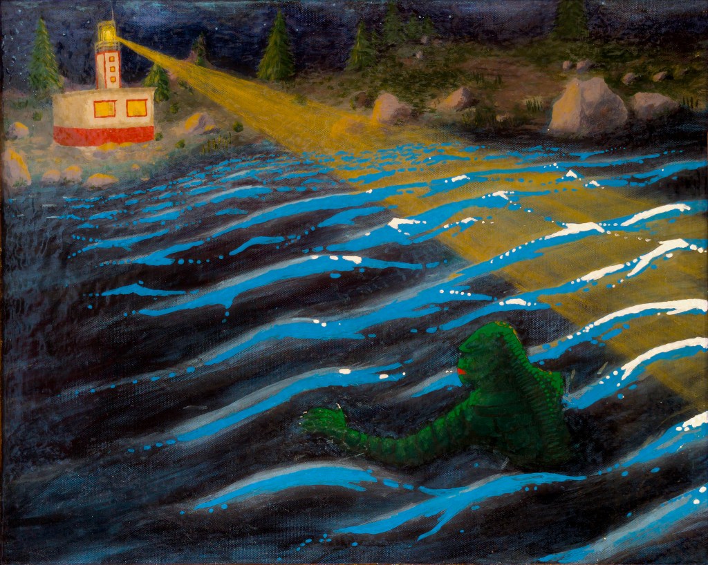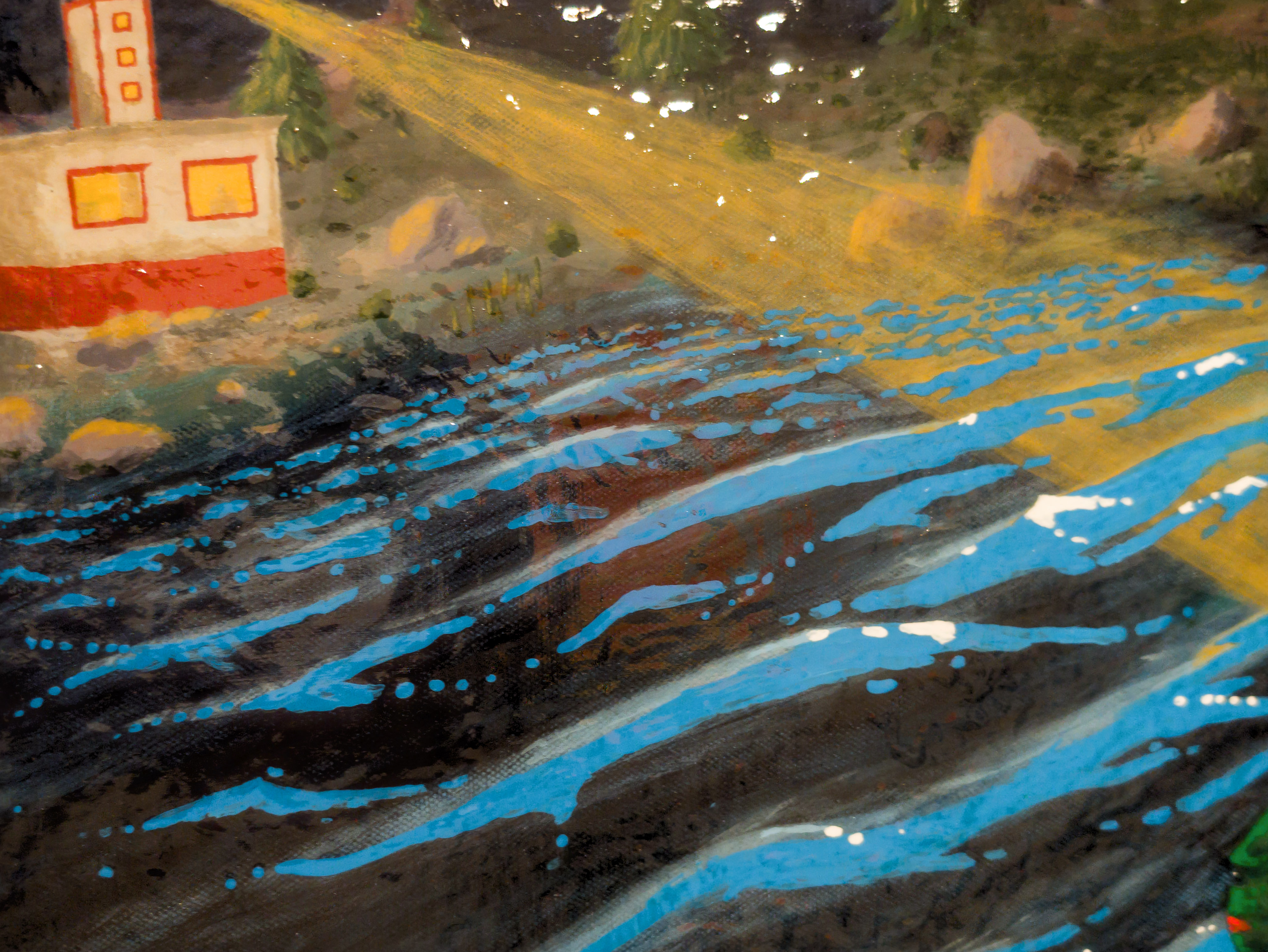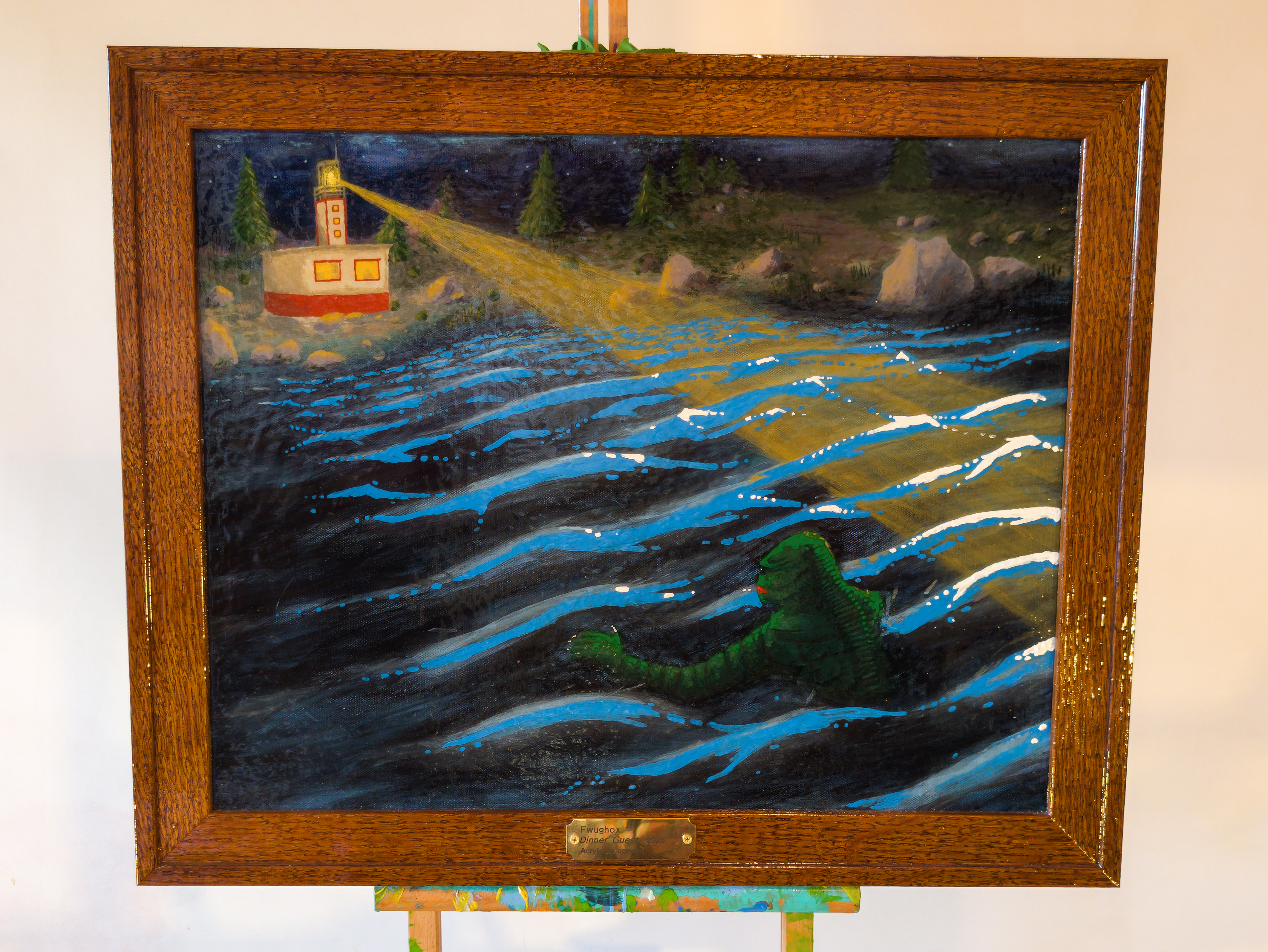 Keeping with my theme of painting frightening creatures, it was only a matter of time before I painted the feisty, ill-mannered antagonist of Creature from the Black Lagoon. I just dig his vibe – or maybe dive it? (Sorry.) I wanted to create what is essentially the kind of painting you’d see at your grandfather’s house near his bourbon, but with an extra fishy friend. To that end, the lighthouse and red oak frame does a lot of the heavy lifting. I also wanted to explore water/spotlight interplay at night, patterns in waves, and the murky, muddy, purple and teal transitions between water and land at night.