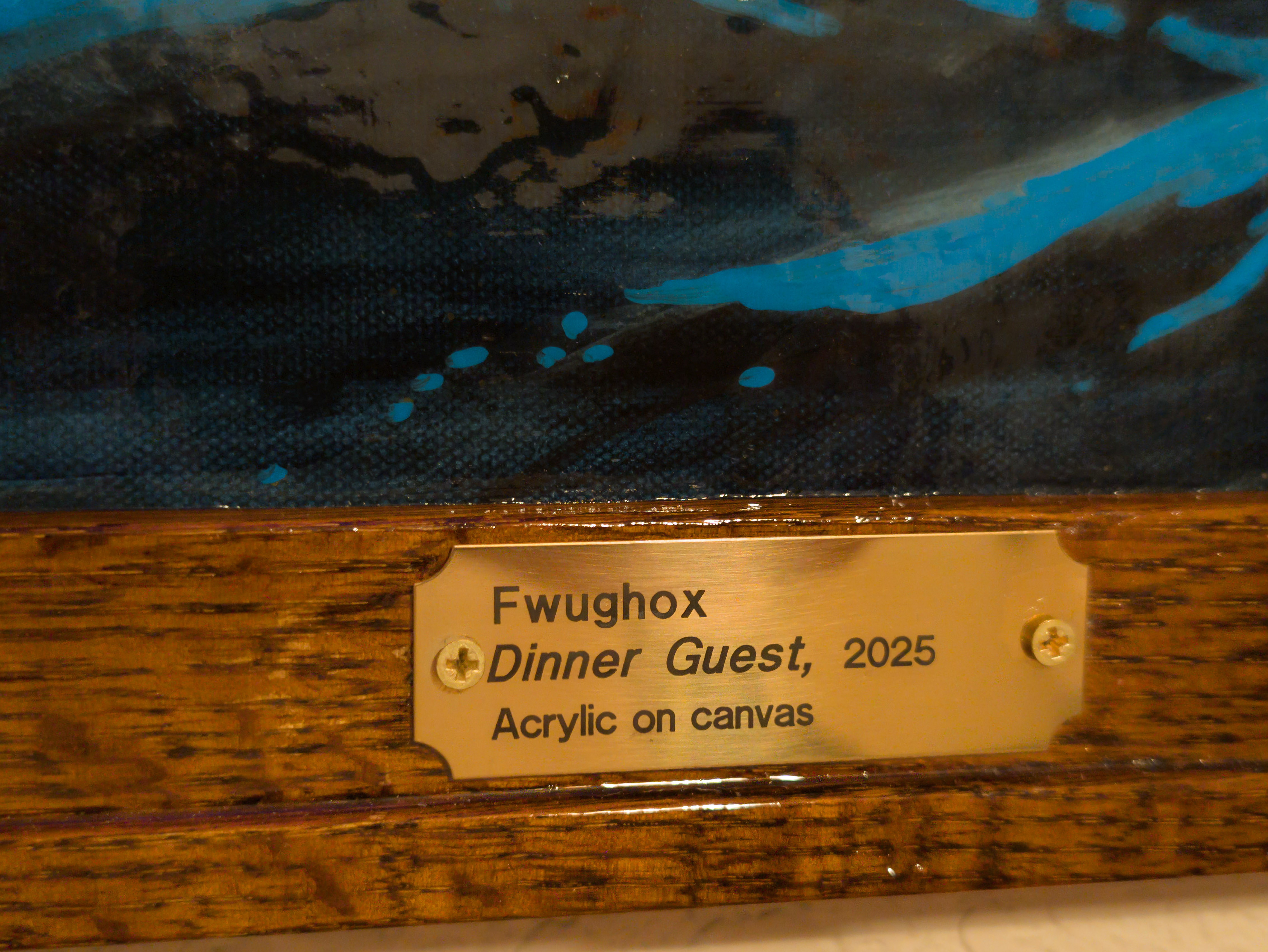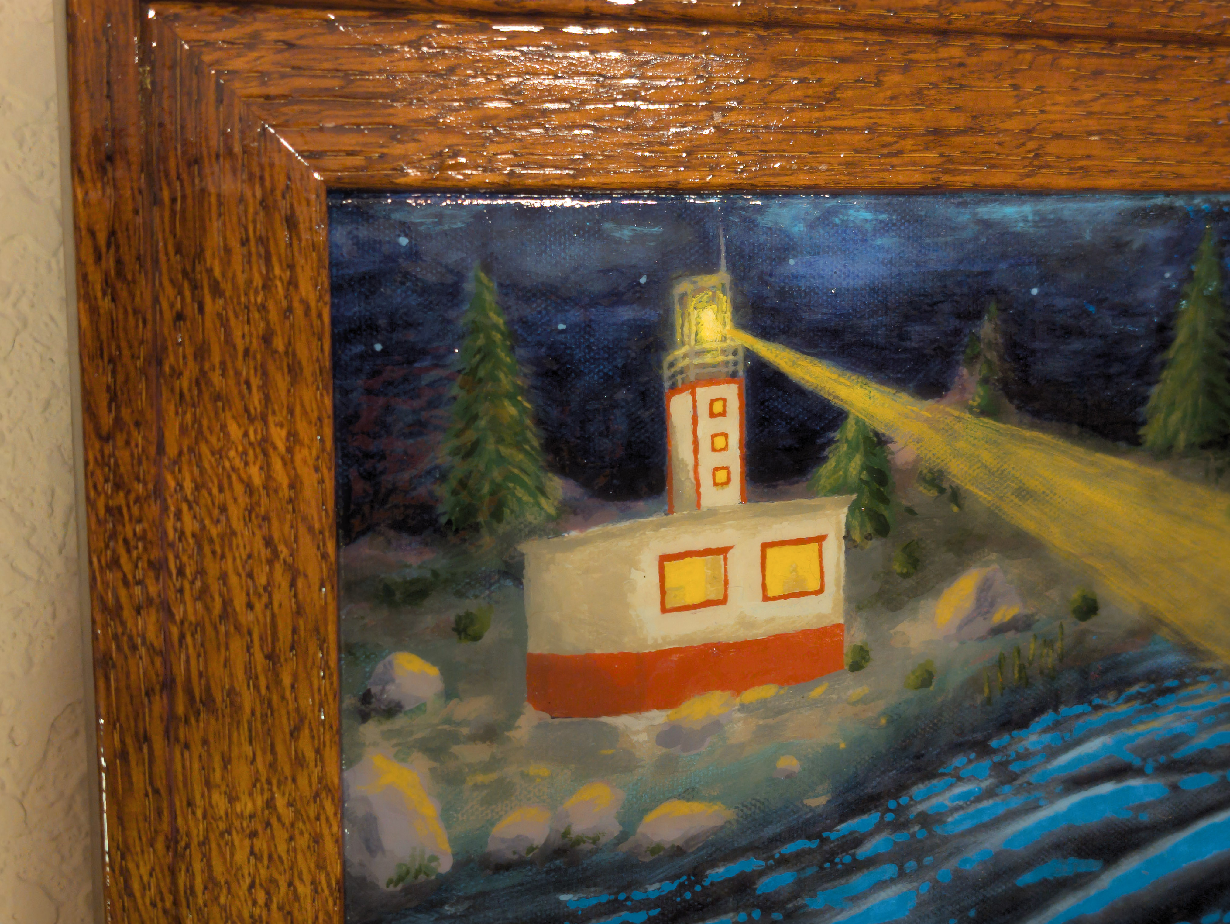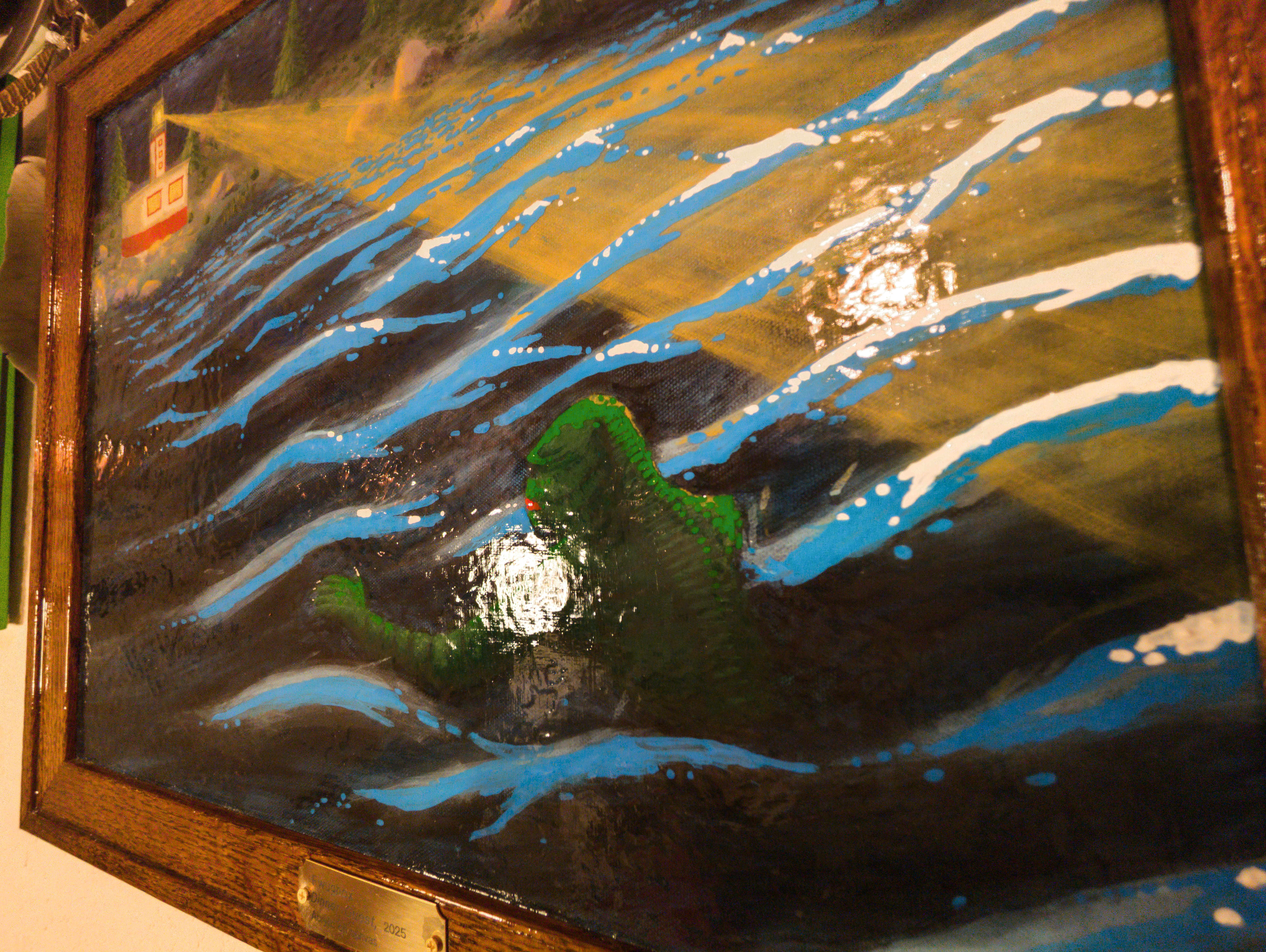 Keeping with my theme of painting frightening creatures, it was only a matter of time before I painted the feisty, ill-mannered antagonist of Creature from the Black Lagoon. I just dig his vibe – or maybe dive it? (Sorry.) I wanted to create what is essentially the kind of painting you’d see at your grandfather’s house near his bourbon, but with an extra fishy friend. To that end, the lighthouse and red oak frame does a lot of the heavy lifting. I also wanted to explore water/spotlight interplay at night, patterns in waves, and the murky, muddy, purple and teal transitions between water and land at night.