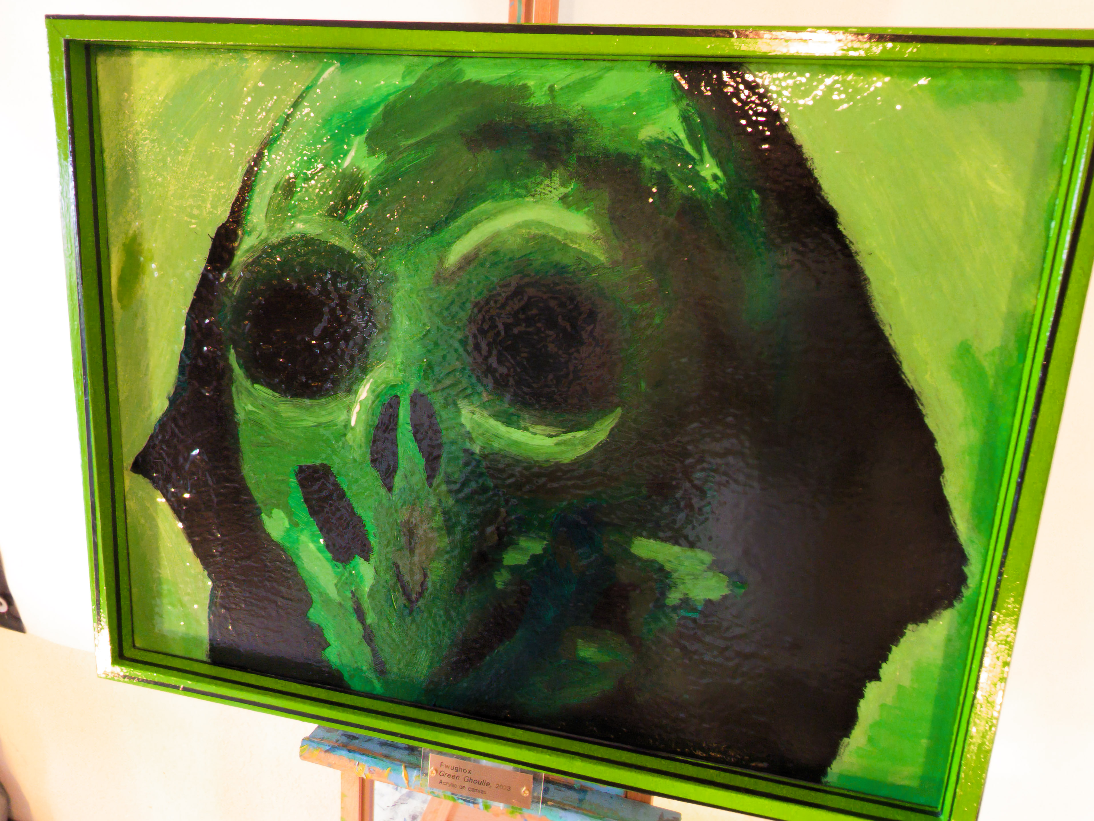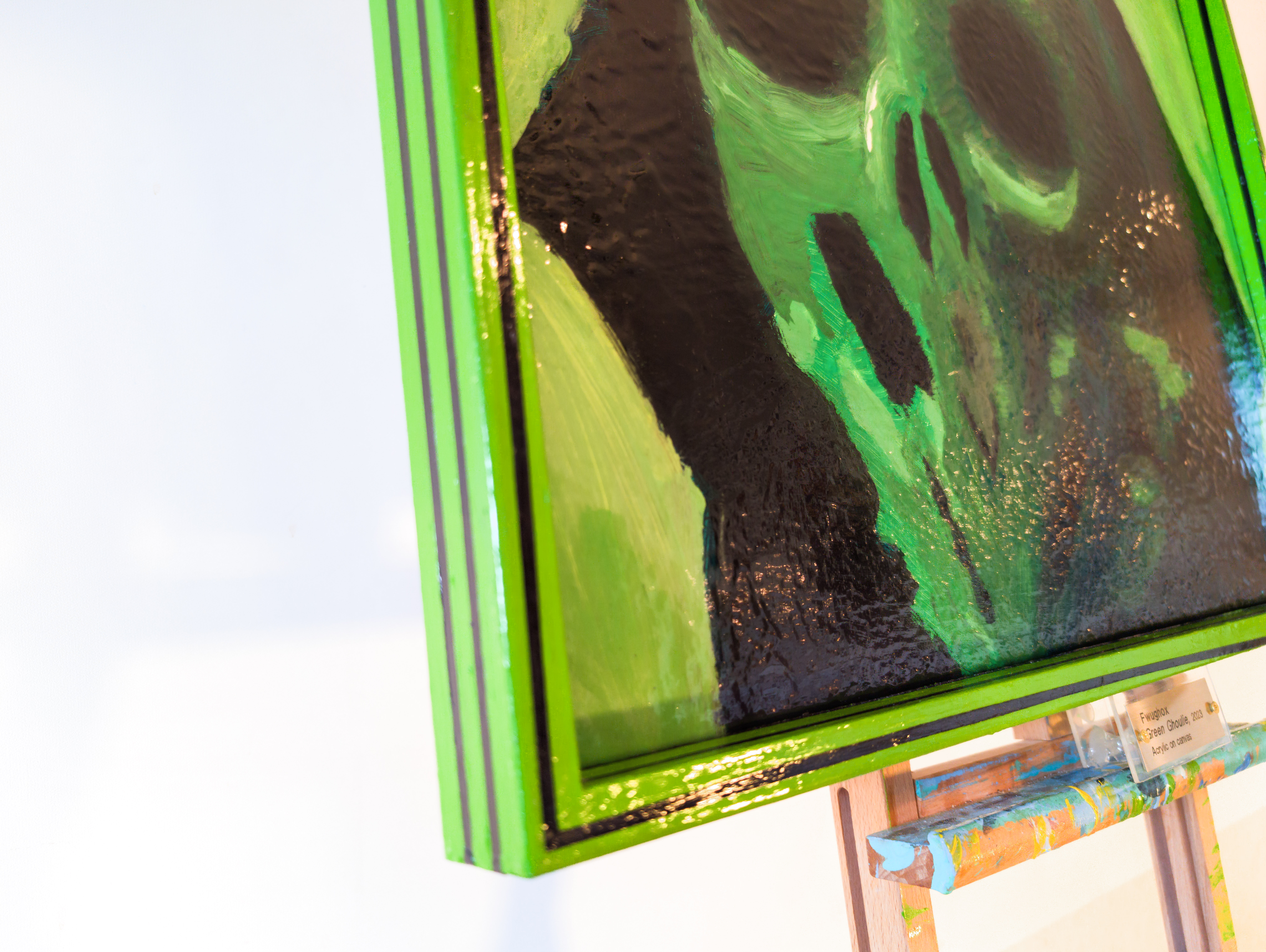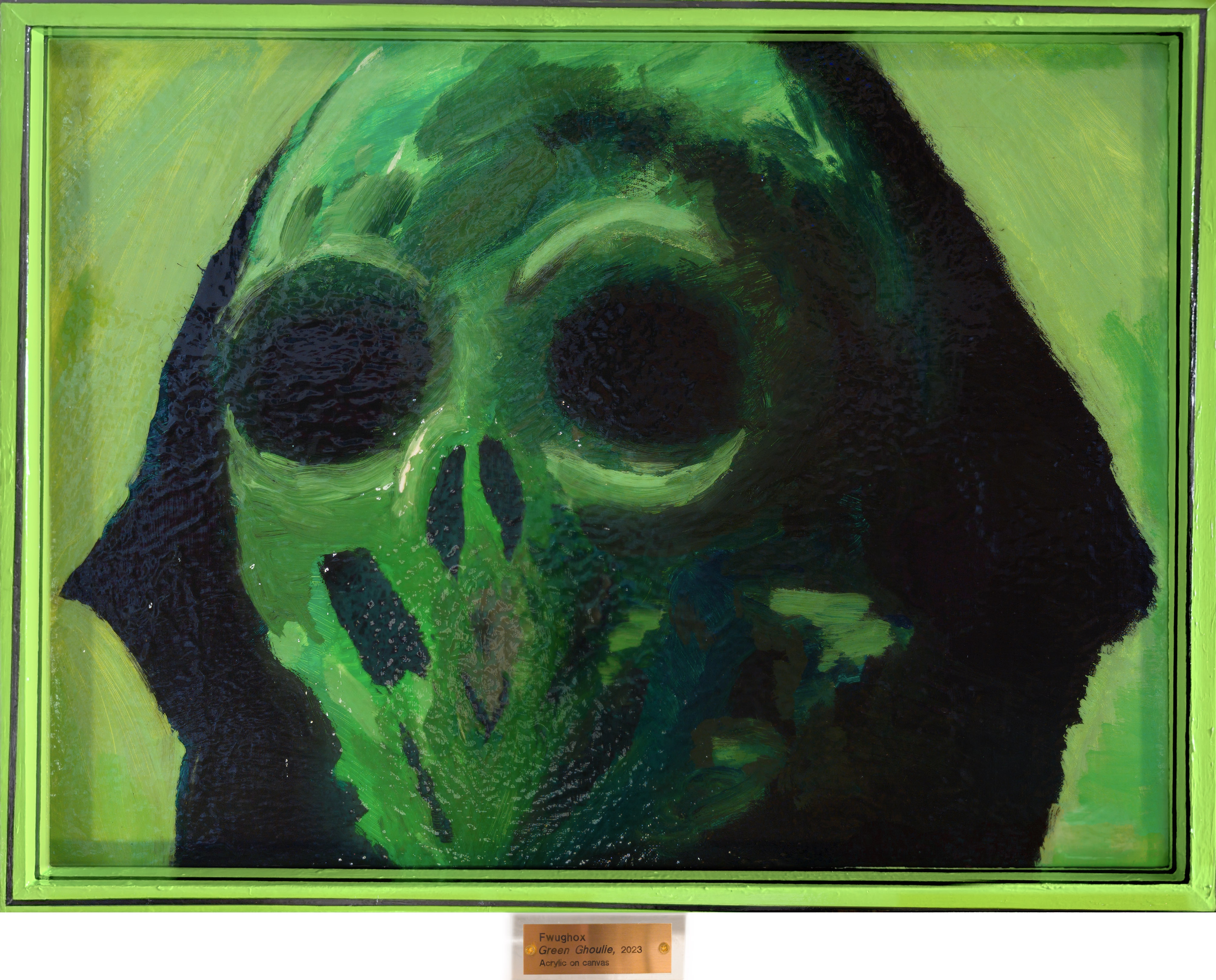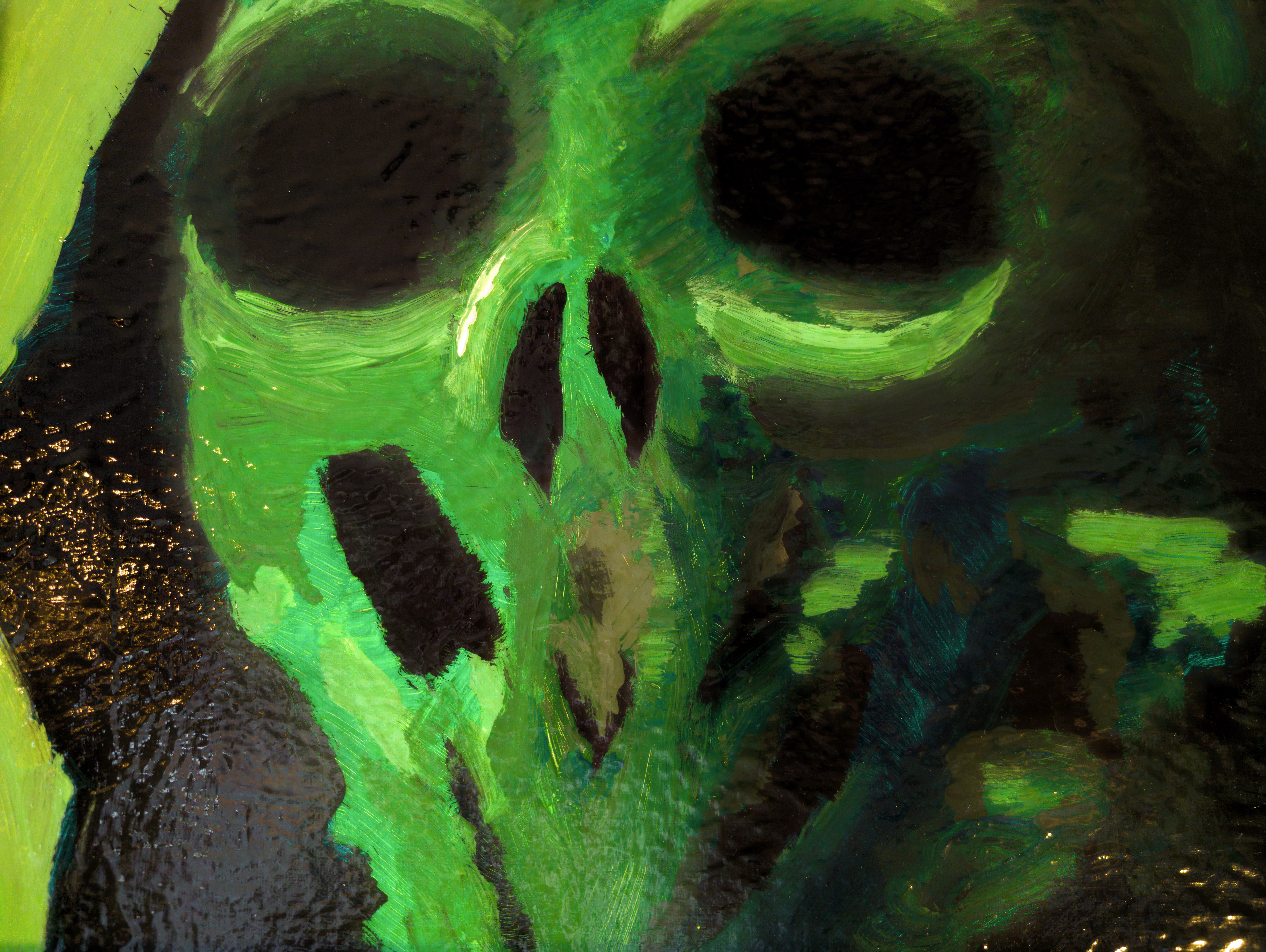 One of my first ever paintings, based off of a sculpture I saw in Paris. I wanted the creature’s stare to transfix the viewer, so it’s sunk into a frame that juts out about 2 inches from the surface of the painting, with a black spiral wrapping around every side. This frame acts as a 3-dimensional complement to the painting itself which funnels your gaze towards its inscrutably black eyes, rendered deep and wavy by a hilarious amount of varnish. It took a while to apply all those layers, but I think the effect was worth it! The creature does frighten me however, and sometimes I feel like it’s subconsciously encouraging me to walk into the ocean. Bummer!