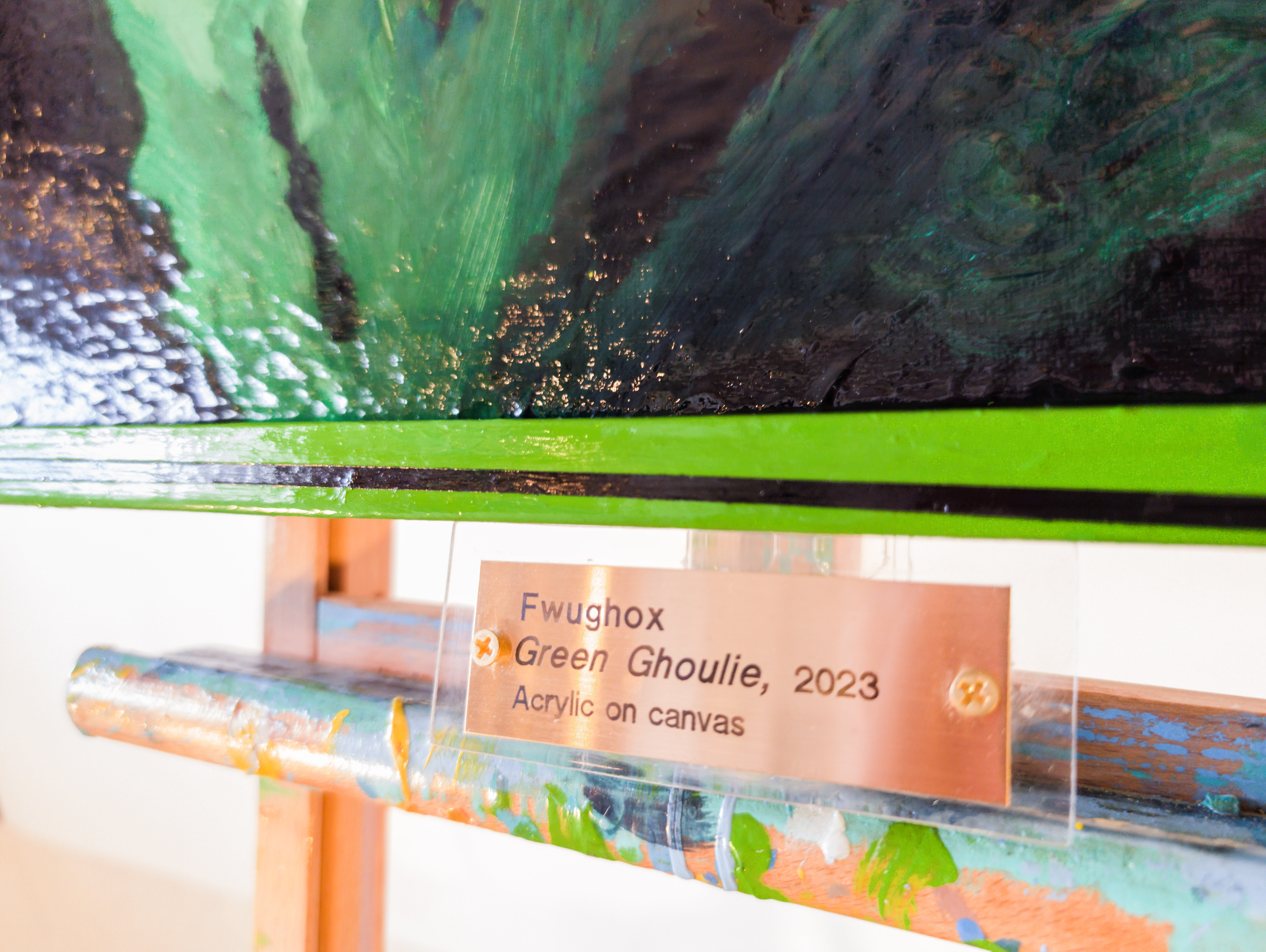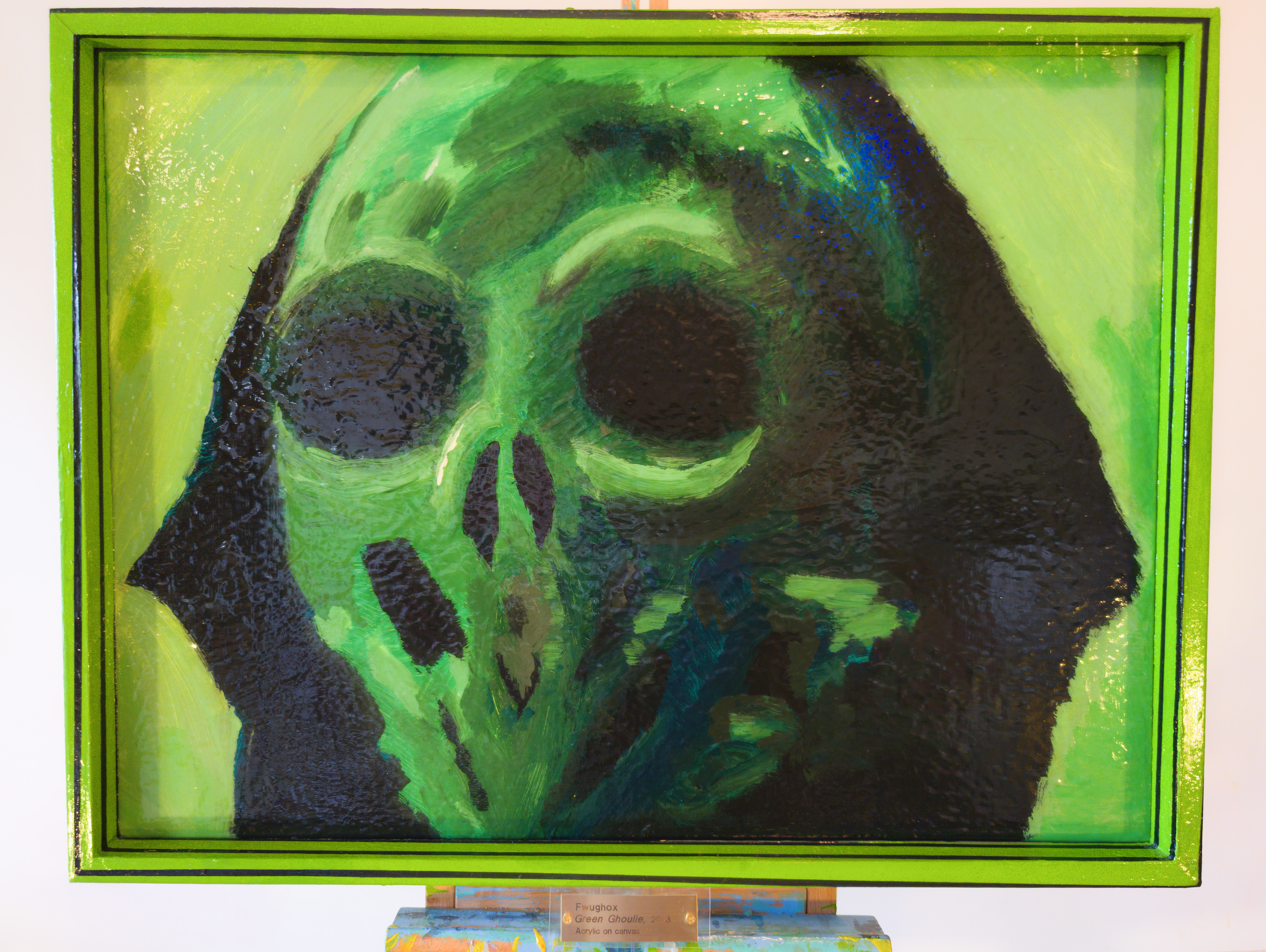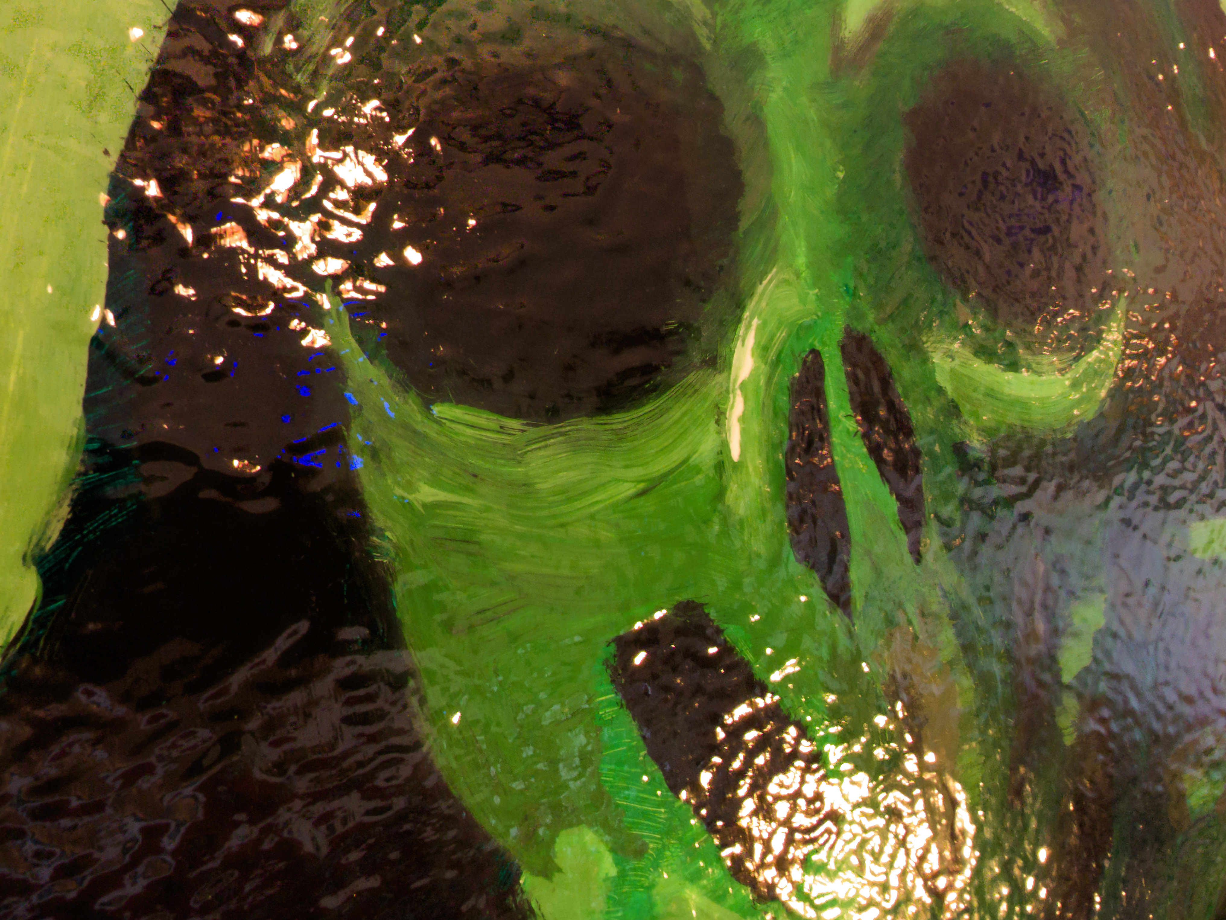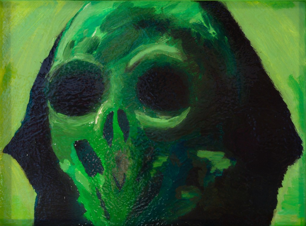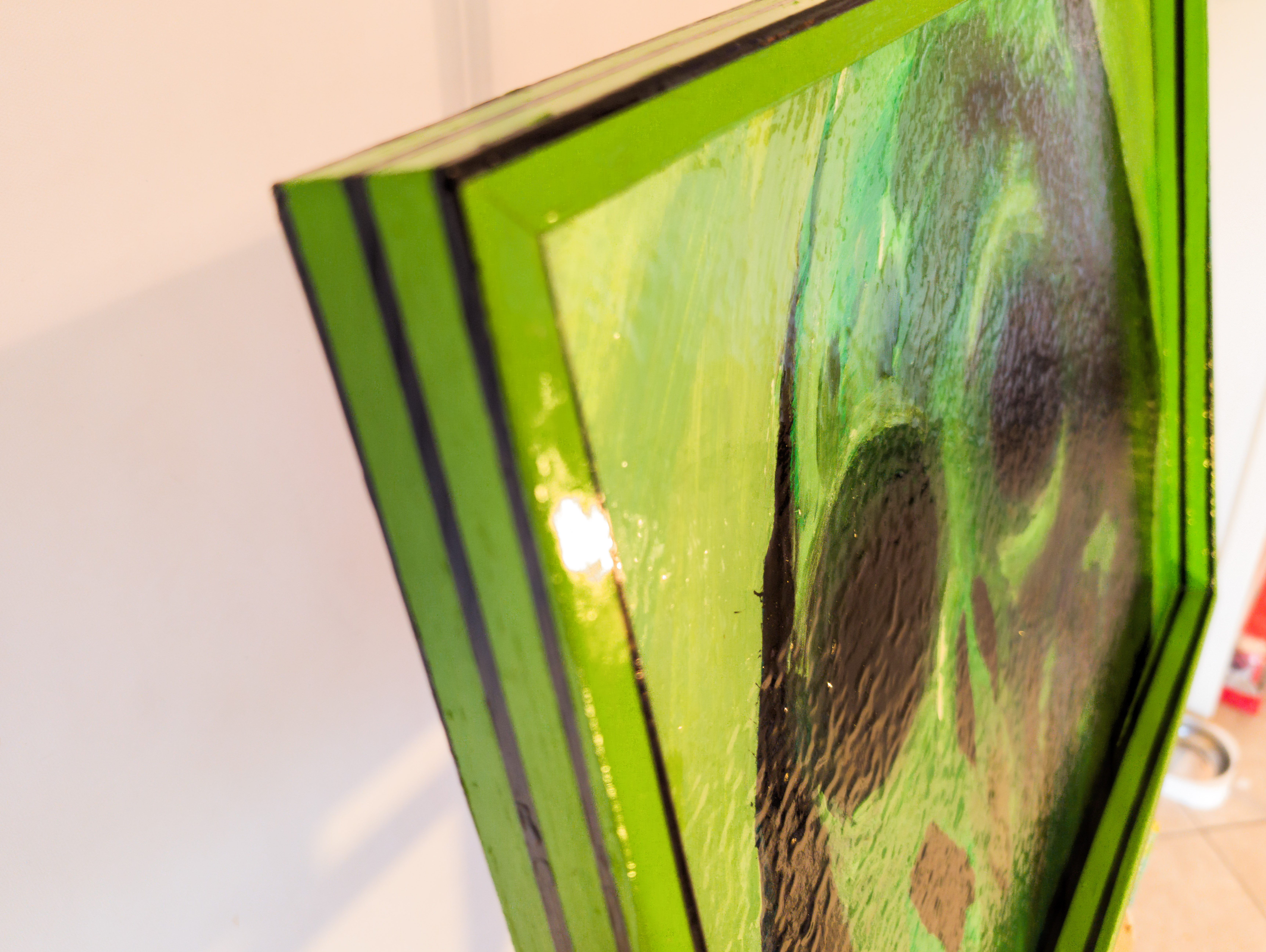 One of my first ever paintings, based off of a sculpture I saw in Paris. I wanted the creature’s stare to transfix the viewer, so it’s sunk into a frame that juts out about 2 inches from the surface of the painting, with a black spiral wrapping around every side. This frame acts as a 3-dimensional complement to the painting itself which funnels your gaze towards its inscrutably black eyes, rendered deep and wavy by a hilarious amount of varnish. It took a while to apply all those layers, but I think the effect was worth it! The creature does frighten me however, and sometimes I feel like it’s subconsciously encouraging me to walk into the ocean. Bummer!