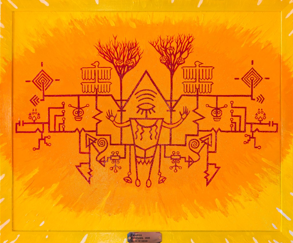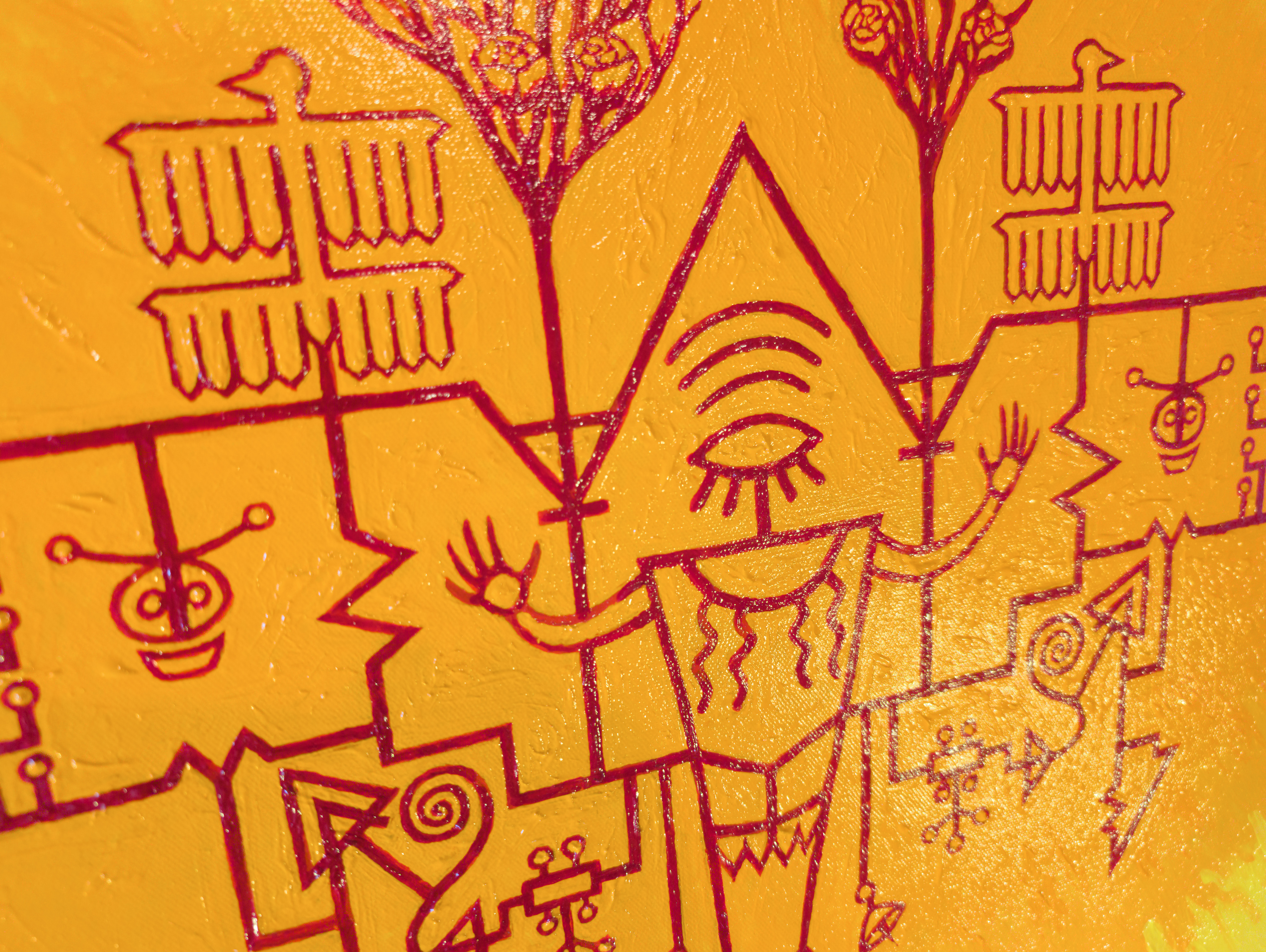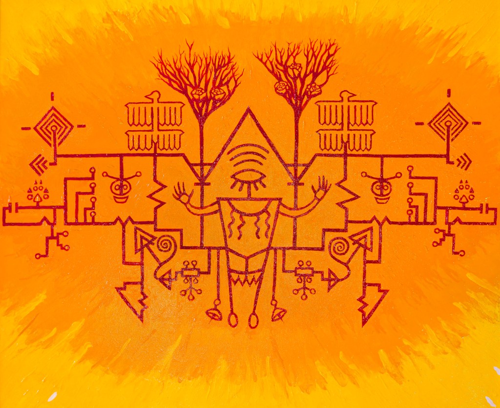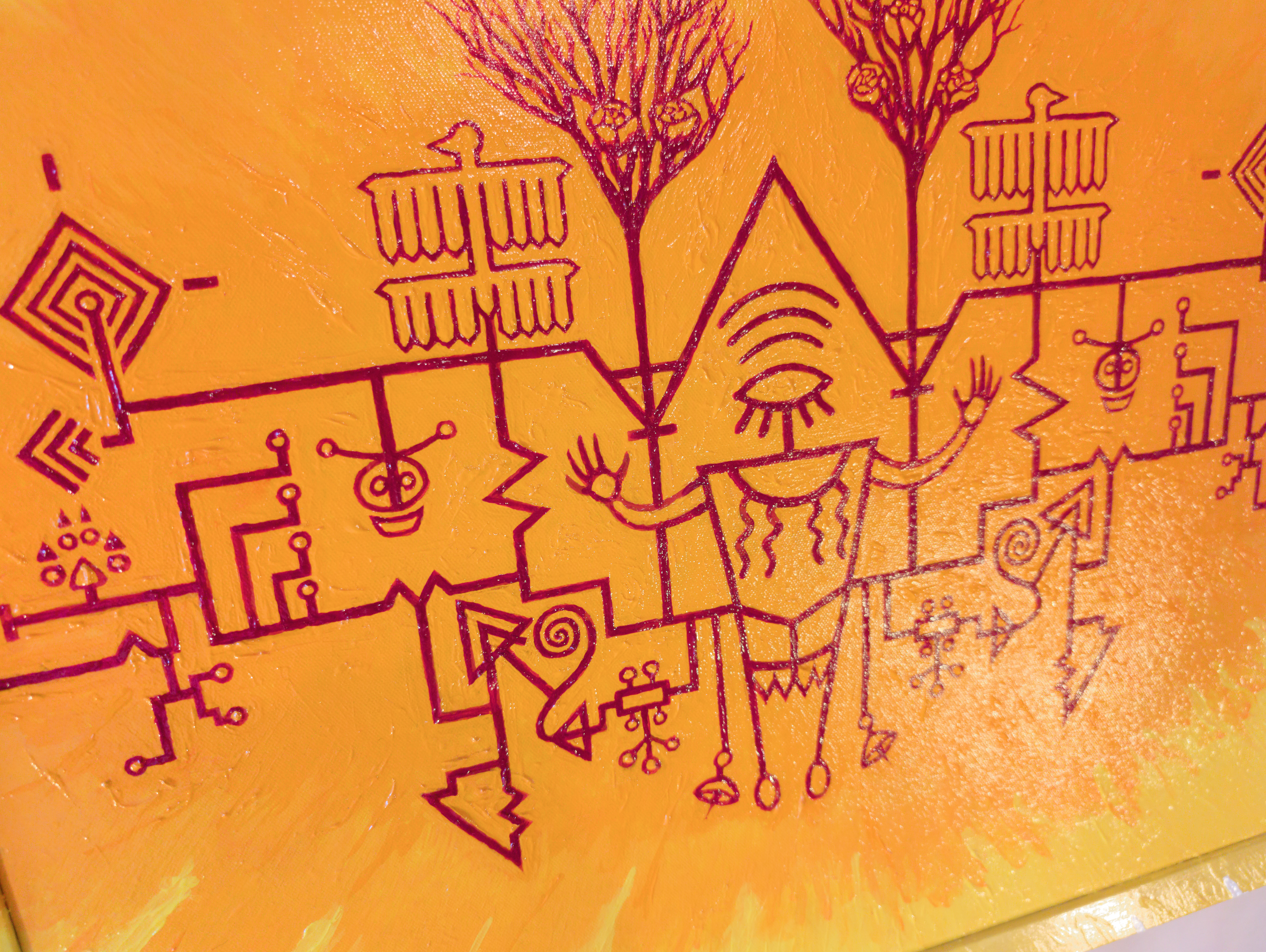 This painting is the result of my love for both the sharp, angular exactness of modern circuit design and the eerie mystical / natural iconography of Pre-Columbian American societies. I wanted to depict the fusion of natural with artificial, of hazy with precise, of lore with data.